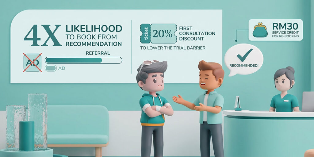 Why it works for healthcare: Patients are 4× more likely to book a clinic that was personally recommended versus one they saw in an ad. The 20% first-consultation discount lowers the trial barrier; the RM30 service credit keeps referrers in your re-booking pipeline.