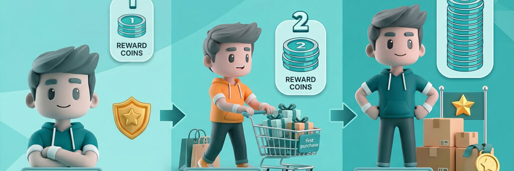 Example: “50 points when they sign up, 200 points when they buy, 500 points when they hit RM1,000 lifetime spend.”