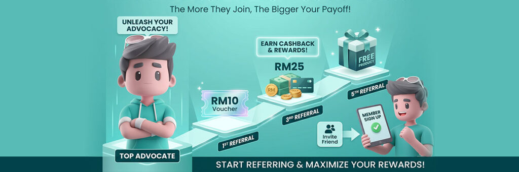 The more friends your customer brings in, the bigger the reward. Set escalating tiers — a RM10 voucher for the first successful referral, RM25 for the third, free product for the fifth — to encourage your top advocates to keep sharing.