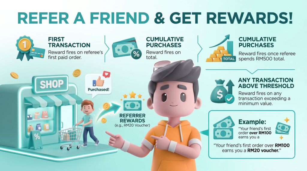 - Cumulative purchases — reward fires once the referee has spent a threshold amount (e.g., RM500 total)