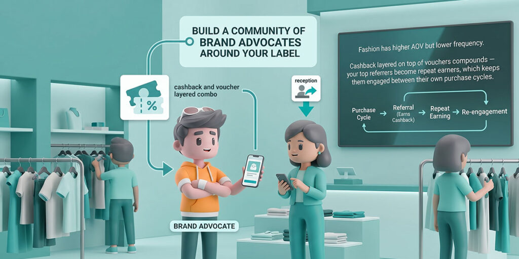 Why it works for retail: Fashion has higher AOV but lower frequency. Cashback layered on top of vouchers compounds — your top referrers become repeat earners, which keeps them engaged between their own purchase cycles.